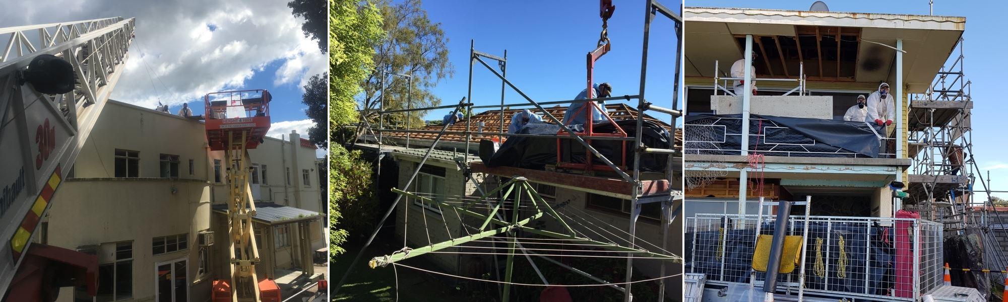 Outside: removal of asbestos containing cladding, soffits and eaves, baseboards (cement sheeting), decramastic roofing tiles, corrugated roofing (Super Six), fencing, AC pipes, removing asbestos guttering, mouldings, decking, soil remediation and fire damage clean-up.